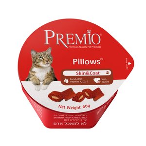 חטיף פרמיו כריות לחתולים לשמירה על העור והפרווה בתוספת טאורין,חומצת אמינו חשובה במיוחד לבריאות החתול וויטמין A,D,E