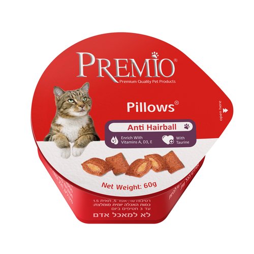 חטיף פרמיו כריות לחתולים מועשר ברכיבים המסייעים במניעת היווצרות כדורי שיער (היירבול) בתוספת טאורין,חומצת אמינו חשובה במיוחד לבריאות החתול וויטמין A,D,E