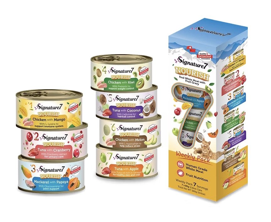 חדש!! סיגנצ’ר 7 מארז מזון בריאות ברוטב פירות שבועי לחתולים 7 טעמים NOURISH